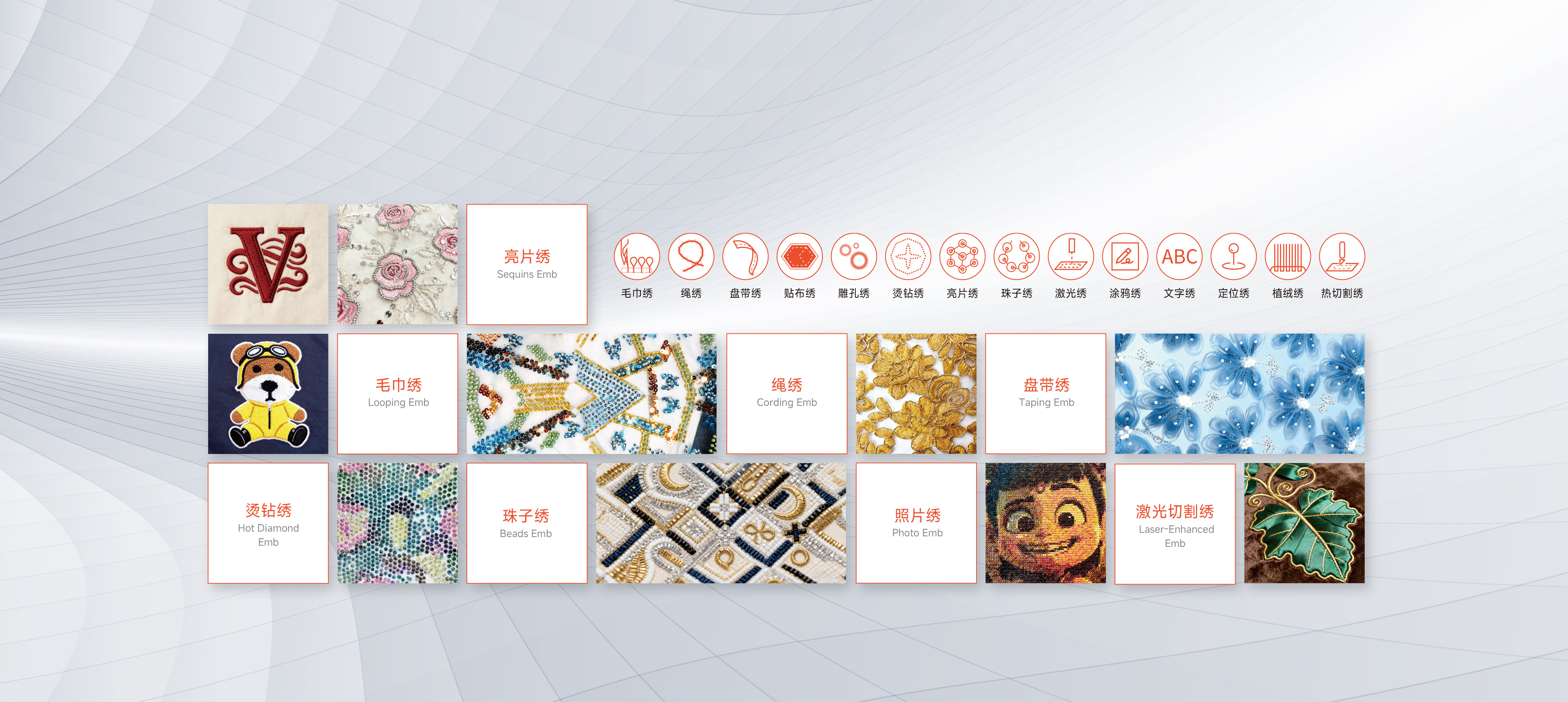 支持毛巾繡、鏈式繡及其與平繡混合繡